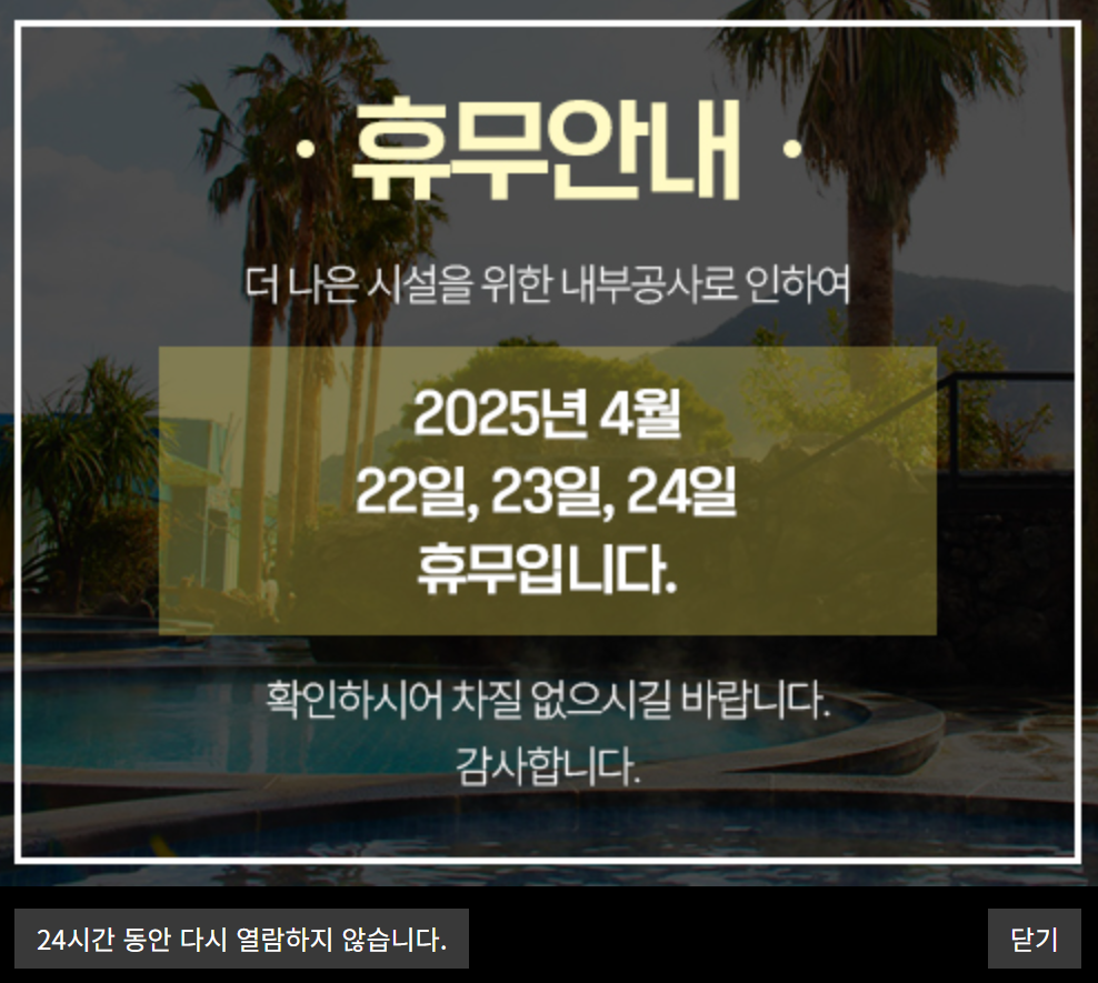 - 실내온천 : 06시 ~ 23시 까지(이용시간은 4시간, 초과 이용시 1시간마다 1000원의 추가비용 발생)